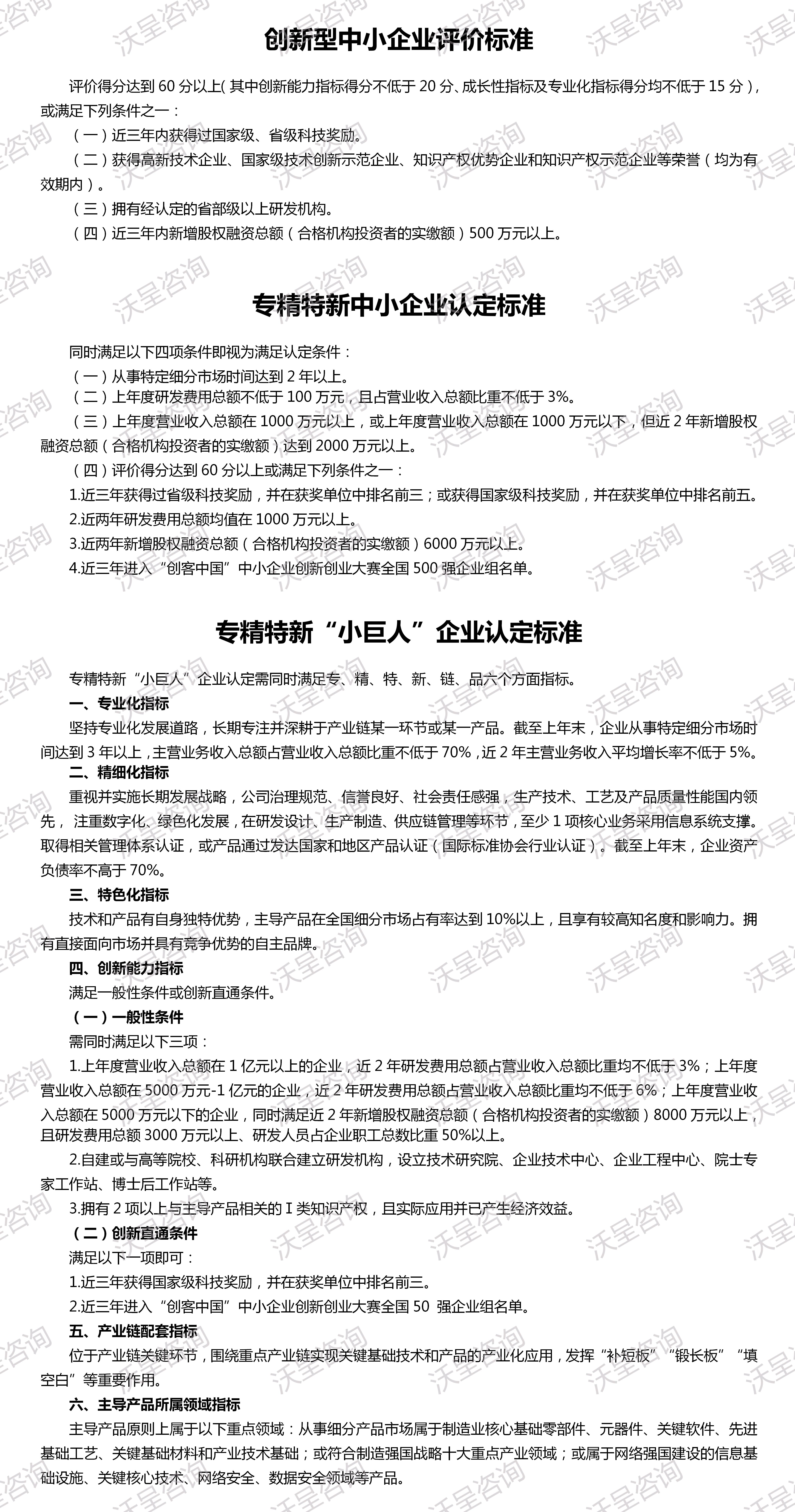 內(nèi)容如下:(附1.創(chuàng)新型中小企業(yè)評(píng)價(jià)標(biāo)準(zhǔn)、2.專精特新中小企業(yè)認(rèn)定標(biāo)準(zhǔn)、3.專精特新“小巨人”企業(yè)認(rèn)定標(biāo)準(zhǔn)